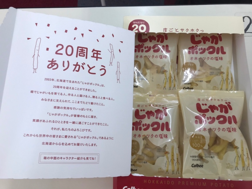 先日、中学生の生徒から北海道土産を頂きました。じゃがポックル。店頭販売は北海道のみで、材料も北海道産に限定した隠れた名品です。