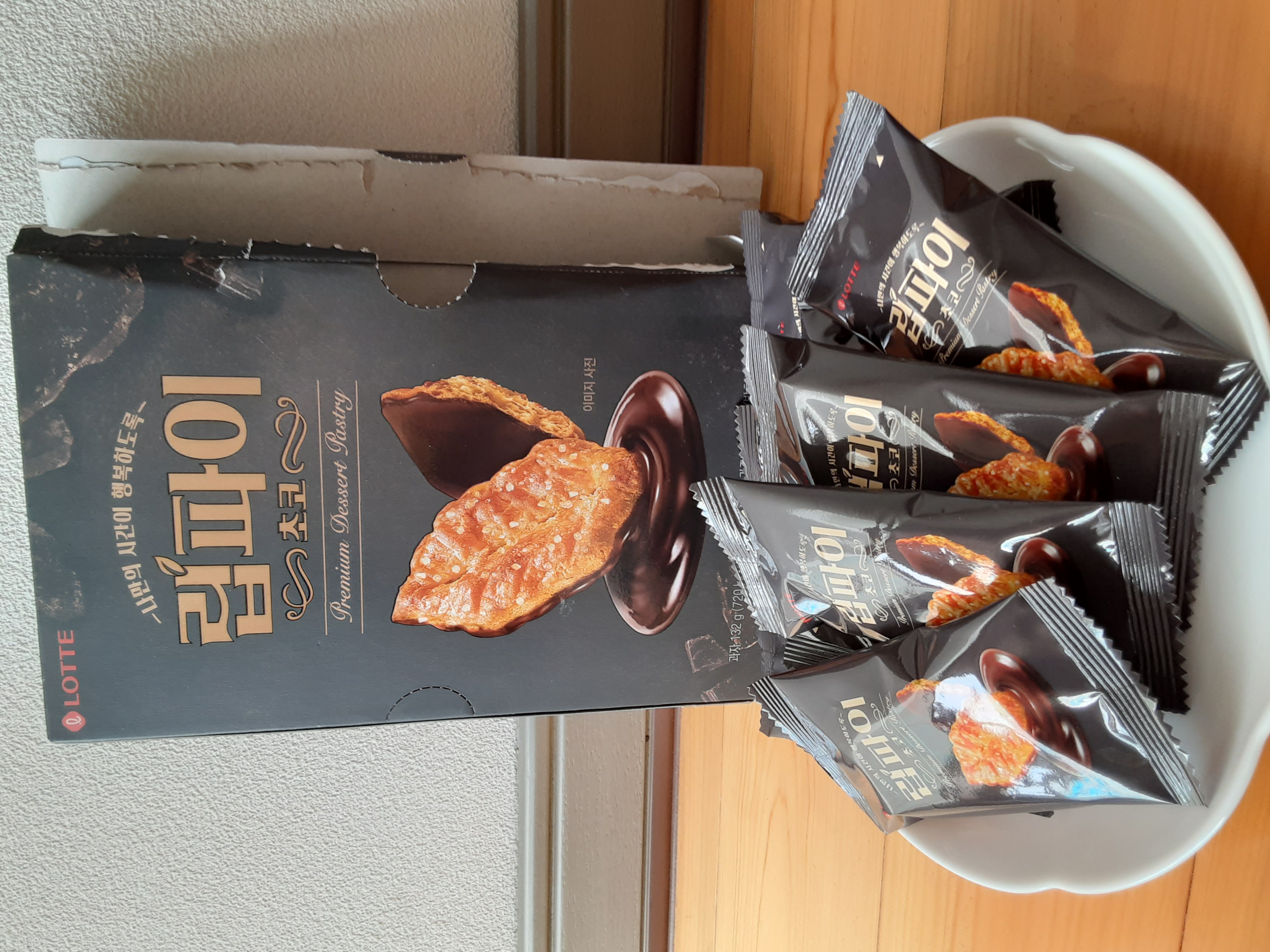 先日、生徒さんから韓国旅行のお土産を頂きました。チョコレートがけのリーフパイ。ロッテワールドで買ってくれたのかな? チョコレートがたっぷりかかった贅沢なリーフパイでした(^^)d
