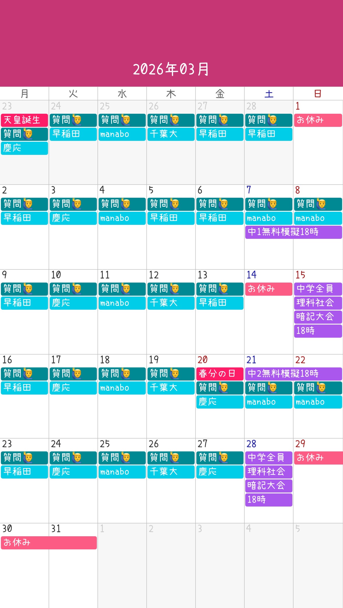 自習生徒専用の質問対応講師の存在!3月の日程表もここだよ